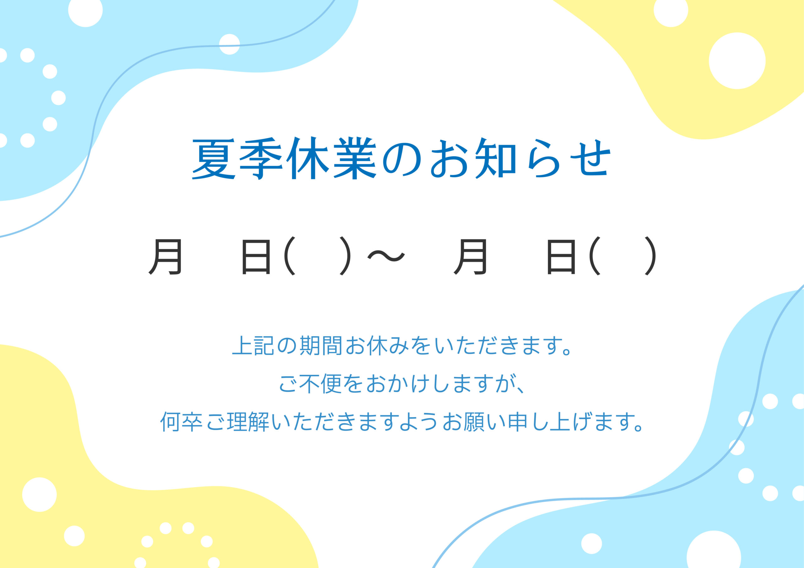 夏休み、夏季休暇・夏季休業のお知らせテンプレート、夏のカラーの流体シェイプのフレーム